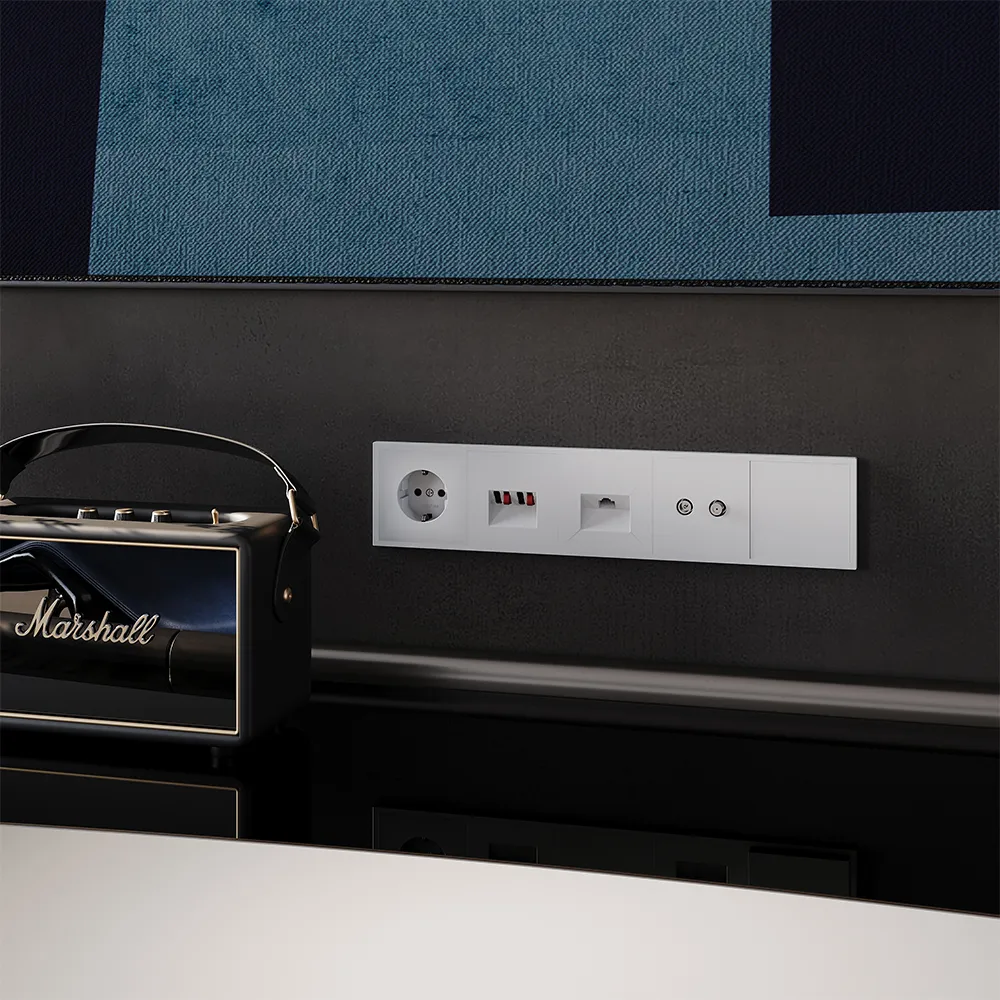 Розетка легко комбинируется с другими устройствами и рамками серии S70 — например, можно разместить рядом телевизионную розетку TV+SAT, электрическую розетку и USB-порт в одной рамке, создав единый медиаблок управления.