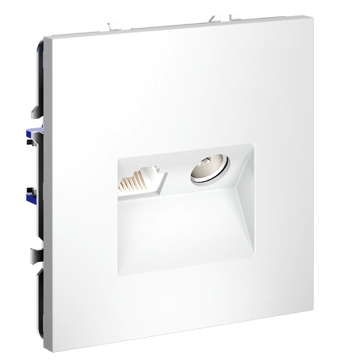 Присутствие гармонии. Розетка VOLTUM S70 TV+RJ45 в белом матовом исполнении становится невидимым проводником технологий: антенна и гигабитный интернет скрыты за фасадом сдержанной элегантности, где цифровая стабильность сливается с интерьером без единого блика.